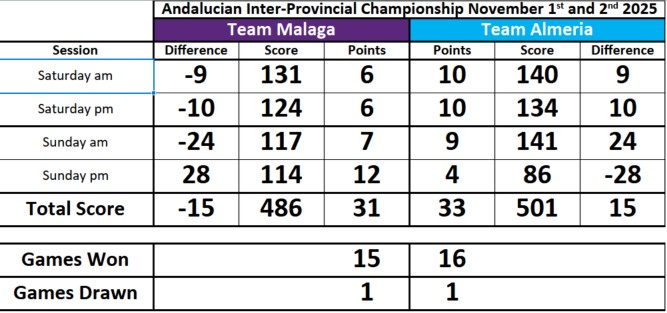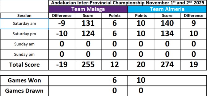 The team plays the Inter-Provincil Championships against Team Malaga annually on a home and away basis. The Inter-Provincial Championships is a most prestigious lawn bowls competition in the south of Spain for which players are selected from the squad to represent Almeria.